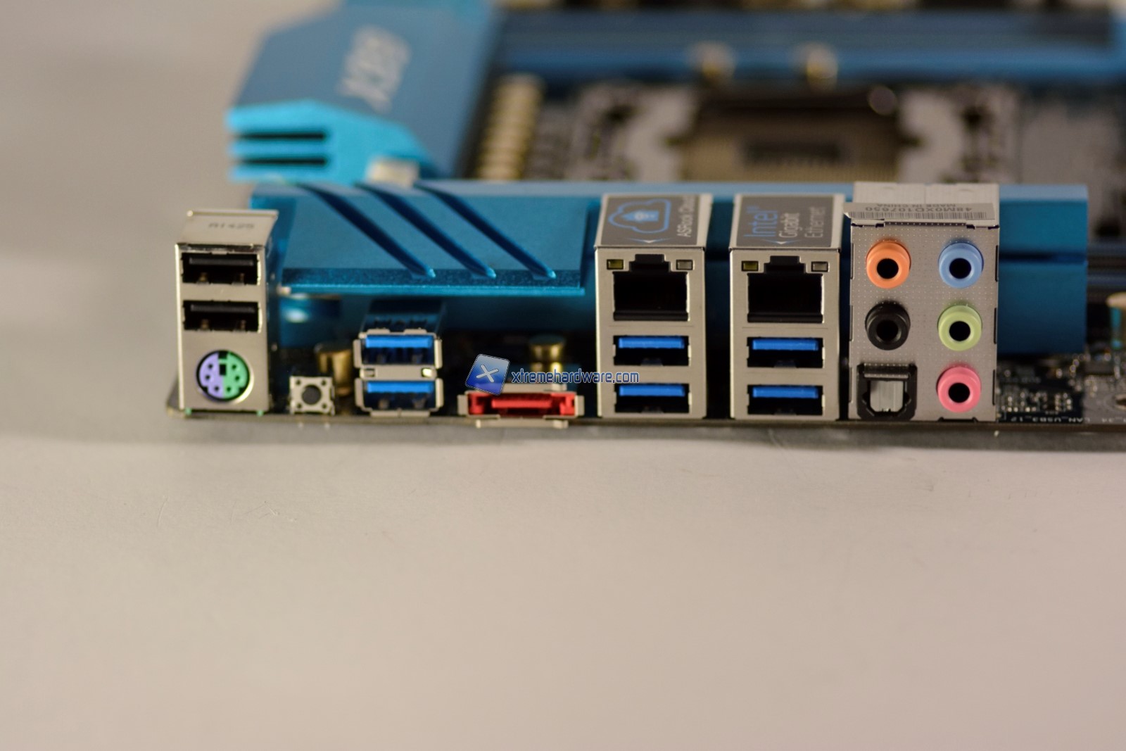 L’insieme di porte I/O è composto da 2 porte USB 2.0 ed un attacco PS/2 misto mouse/tastiera, il micro pulsante di clear CMOS, 6 porte USB 3.0, una porta eSATA, 2 attacchi Ethernet RJ45 in standard Gigabit ed il blocco di I/O audio.