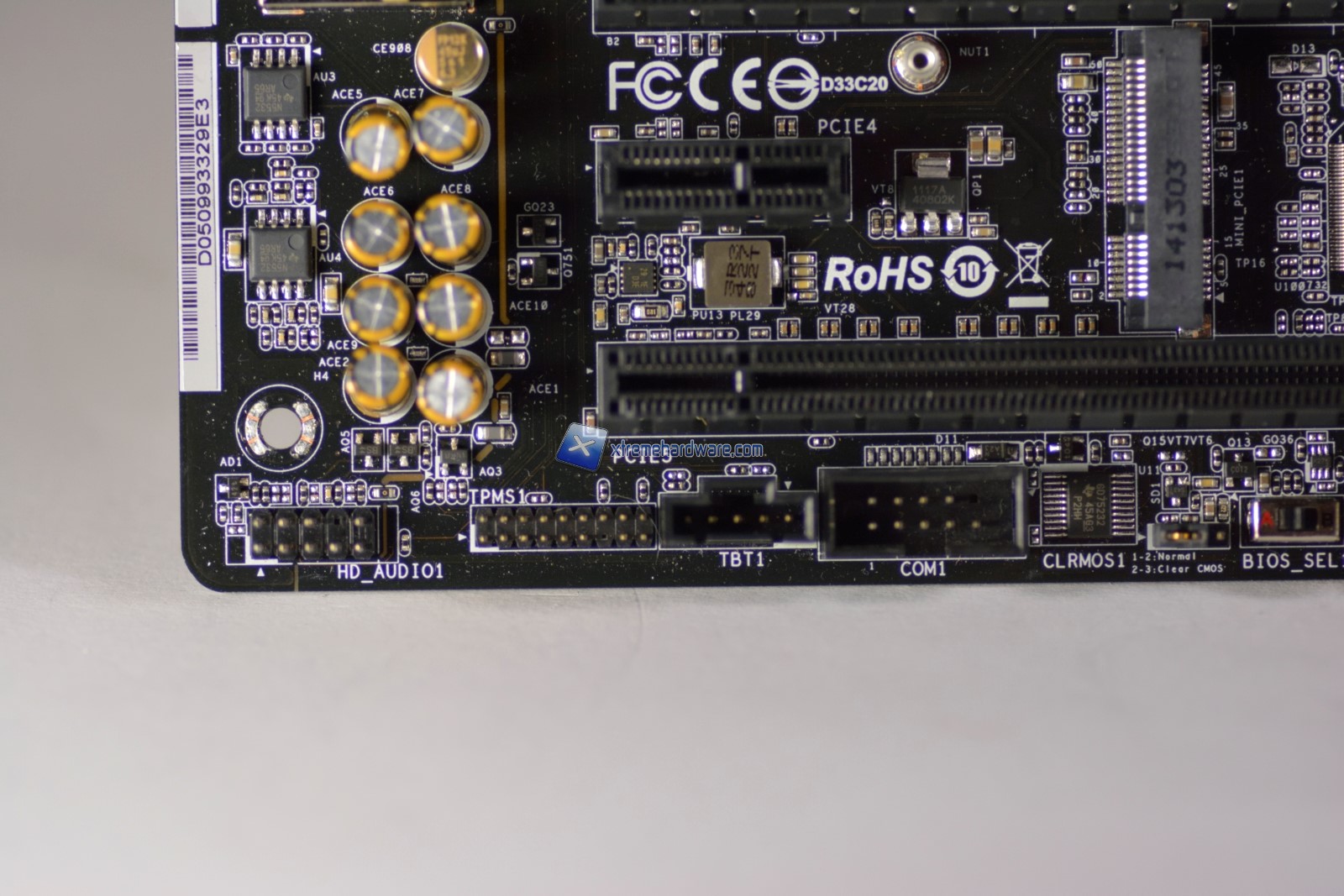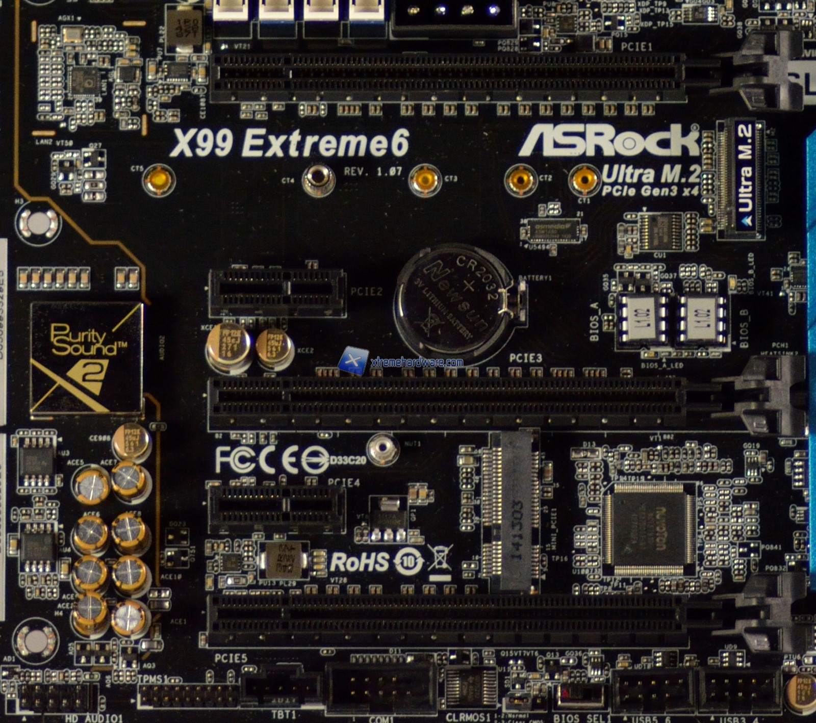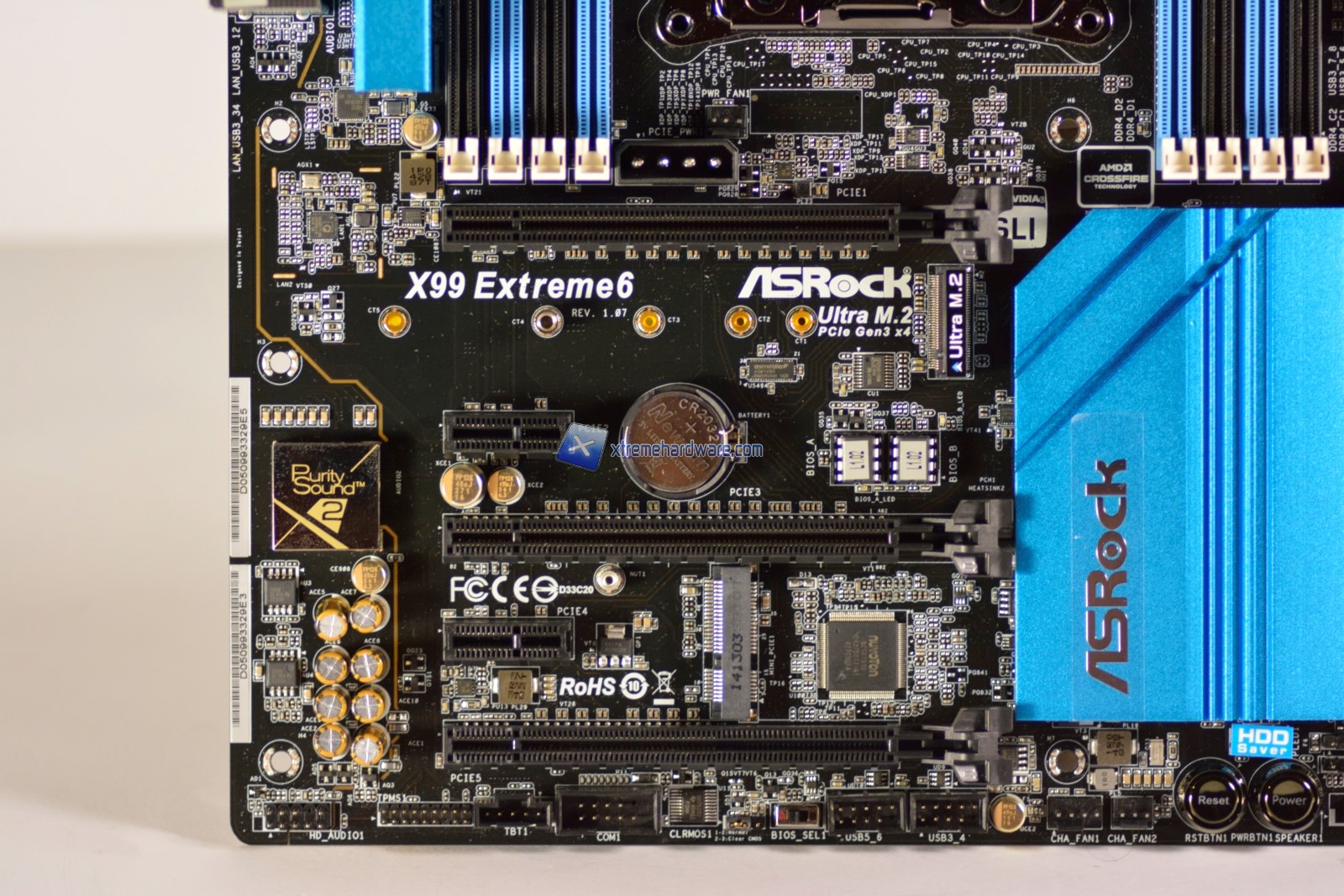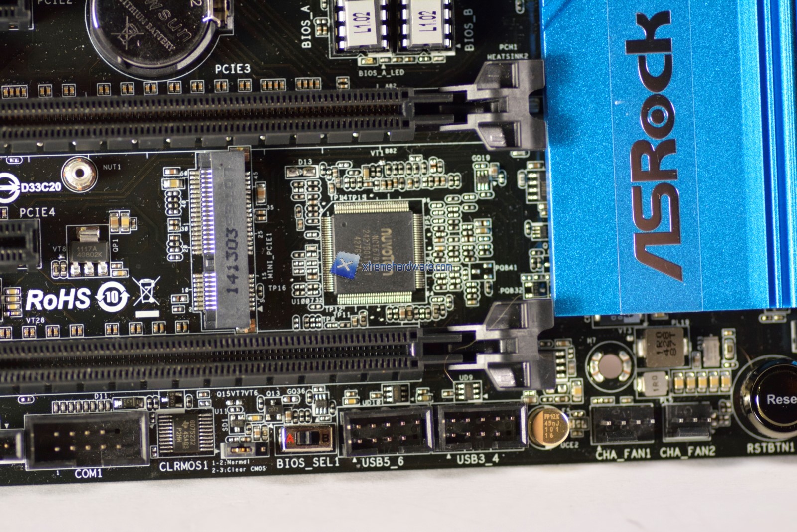 Tra il 1° ed il 3° slot possiamo notare la classica batteria a pastiglia, mentre sulla destra l’attacco Ultra M.2 che beneficia della velocità del Bus PCIe 3.0 per SSD con lunghezza fino a 110mm. Tra il 3° ed il 5° slot PCI Express troviamo il controller Nuvoton per la rilevazione delle tensioni e il controllo del regime di rotazione delle ventole nonché uno slot mini PCIe. In questo slot sarà possibile installare un modulo WiFi/Bluetooth, fornito di serie nella variante Extreme6/ac.