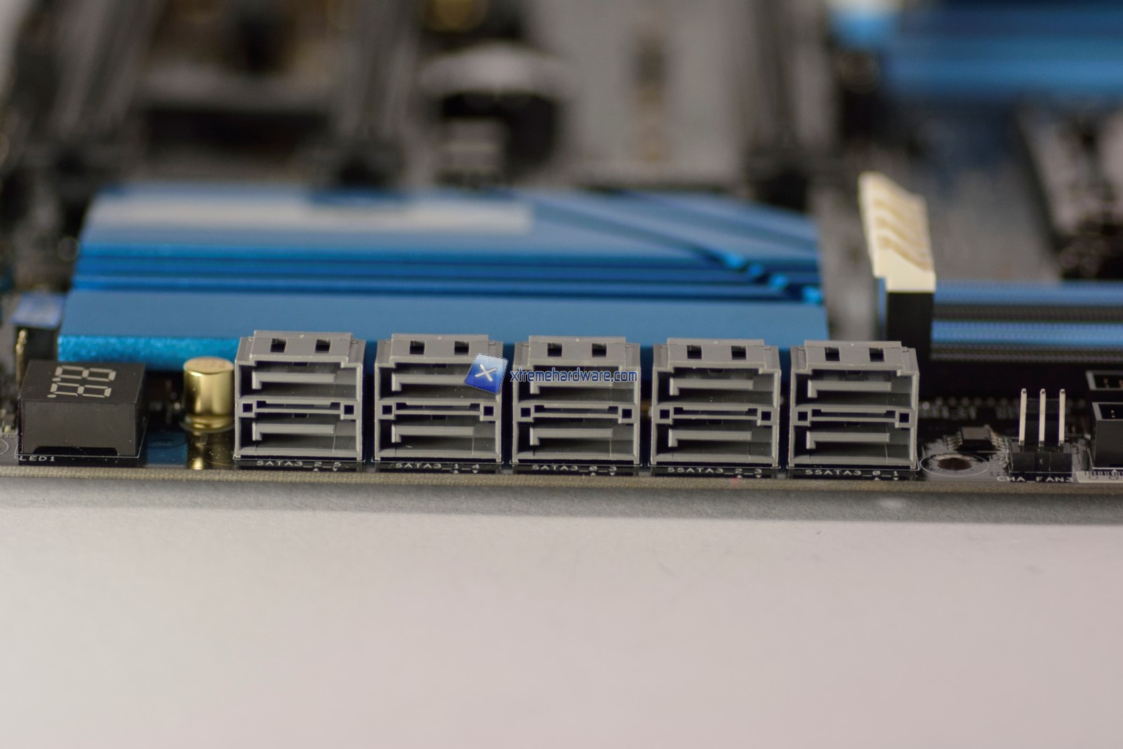 I 5 slot PCIe sono dislocati razionalmente in modo da poter realizzare un sistema a 3-Way sia SLI che CrossFire anche in caso di schede video dotate di dissipatori particolarmente voluminosi, grazie alla buona distanza tra gli slot PCIe x16 a lunghezza piena. Ricordiamo che con CPU Core i7 5960X e 5930K sarà possibile ottenere una configurazione x16/x16/x8 (3-way SLI o CrossFire), mentre installando una CPU 5820K la bandwidth disponibile si limiterà a x16/x8/x4: non sarà quindi possibile installare un 3-way SLI con questa CPU. Occorre inoltre ricordare che l’ultimo slot condivide 4 linee con lo slot per SSD Ultra M.2. Non sarà quindi possibile effettuare un 3-way SLI con CPU top di gamma e sfruttare al contempo l’ultra M.2. Per finire, troviamo 2 slot PCI Express 2.0 x1 mentre sono assenti slot PCI tradizionali. Da notare la presenza di un connettore molex in prossimità del primo slot PCI Express, il cui collegamento è consigliabile per stabilizzare l’alimentazione degli slot PCI Express in caso di configurazione multi-VGA. Purtroppo l’accesso a questo connettore è piuttosto scomodo rispetto ad un posizionamento angolato sul lato destro della scheda madre.