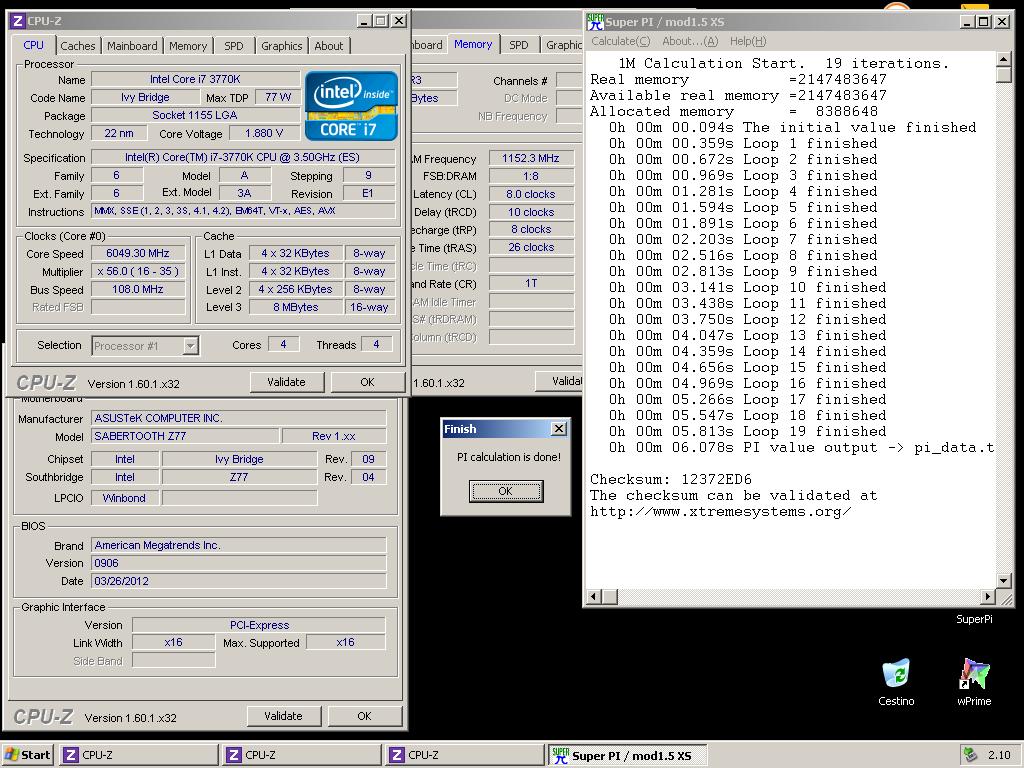 Ormai chi ci segue sa benissimo che oltre ad i classici test, effettuiamo anche dei benchmark di overclock spinto per le schede madri che analizziamo. In questo modo abbiamo la possibilità di verificare la risposta dell’hardware in condizioni d’uso eccezionale o meglio dire estremo. Gli screen che vi proponiamo sono realizzati con tool utilizzati in ambito agonistico e per questo si può comparare il risultato ottenuto con quelli postati sul sito Hwbot in modo da competere con altri utenti, ottenere punti e capire la bontà del risultato conseguito. Abbiamo ragggiunto in overclock estremo la frequenza di 6050MHz con il Core i7 3770K, terminando con successo il veloce benchmark Super Pi 1MB.